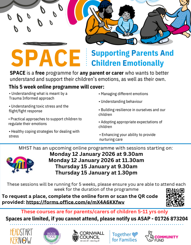The NHS Mental Health Support Team are running a SPACE programme for parents and carers. Please see the poster below advertising the next session, starting in January 2026.