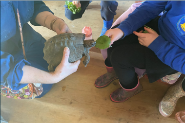 The tortoises at the farm had also just come out of hibernation. So, we met one of them and tried our best to feed them the pennyworth leaves we have brough back with us from our walk.