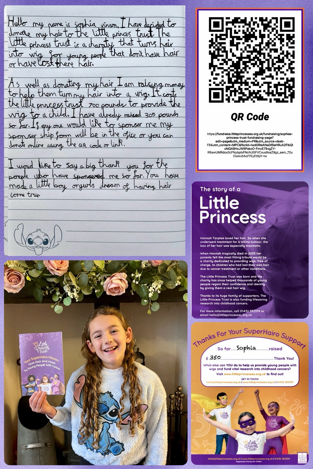 Sophia Vinson is currently growing her hair to have it cut in aid of the Little Princess Trust. For further information and to find out how you can support Sophia, please see her poster below: