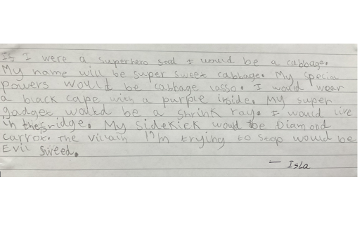 Here is a piece of writing from Isla who imagined herself as a superhero cabbage called Super Sweet Cabbage.
